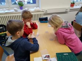 Es darf gespielt werden! Die Erstklässler konnten es gar nicht erwarten, am letzten Tag vor den Winterferien loslegen zu können. Viele verschiedene Spiele fanden den Weg von Zuhause ins Klassenzimmer. Natürlich wollte jeder gewinnen. Auch verlieren muss bekanntlich gelernt werden. Ruckzuck verflog unsere Spielezeit. Wir werden es bald mal wieder machen. Bis dahin üben bestimmt einige Kinder z. B. das Festhalten sowie Mischen von Spielkarten. Manche bringen es schon richtig gut. Super!
